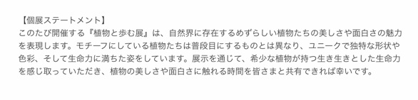 花びらの外形を取り除いた色彩豊かな押し花や、樹木や多肉植物などの生命力溢れる繊細な描写、ひとつとして同じ形が存在しない多様性と芸術性を持つイチョウの葉拓など、それぞれのアーティストによる異なる視点や手法で、植物に対する愛情や魅力が表現されています。